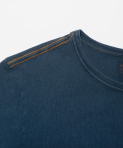 Crew neck tee made in light, soft organic cotton knit with irregular character and a little hairiness. It’s been washed down to a beautiful, faded blue shade and has that lived-in look that we think goes so well with our jeans. It features a chest pocket with our jeans’ back pocket embroidery and chain stitches along the shoulder made with orange thread.