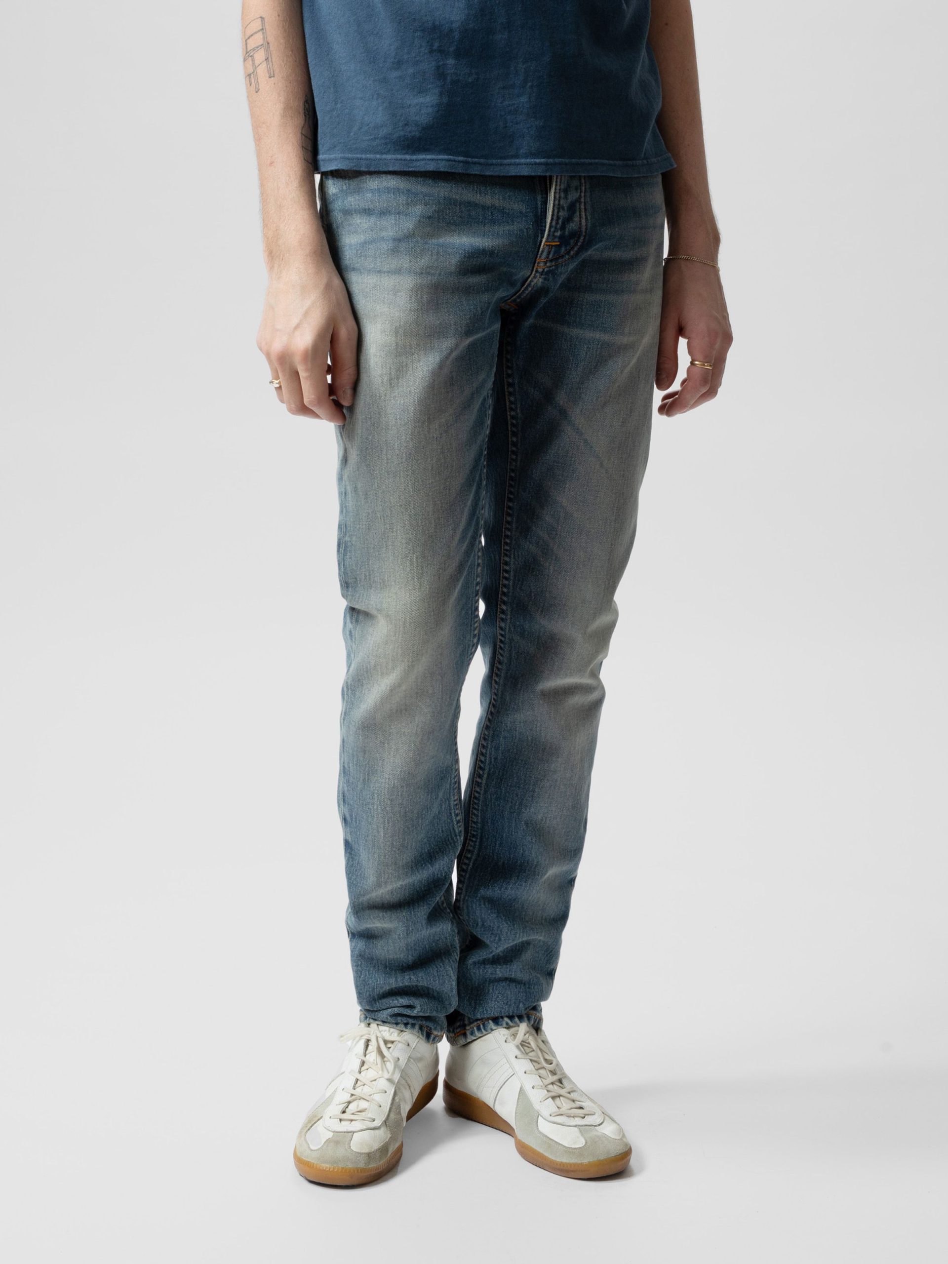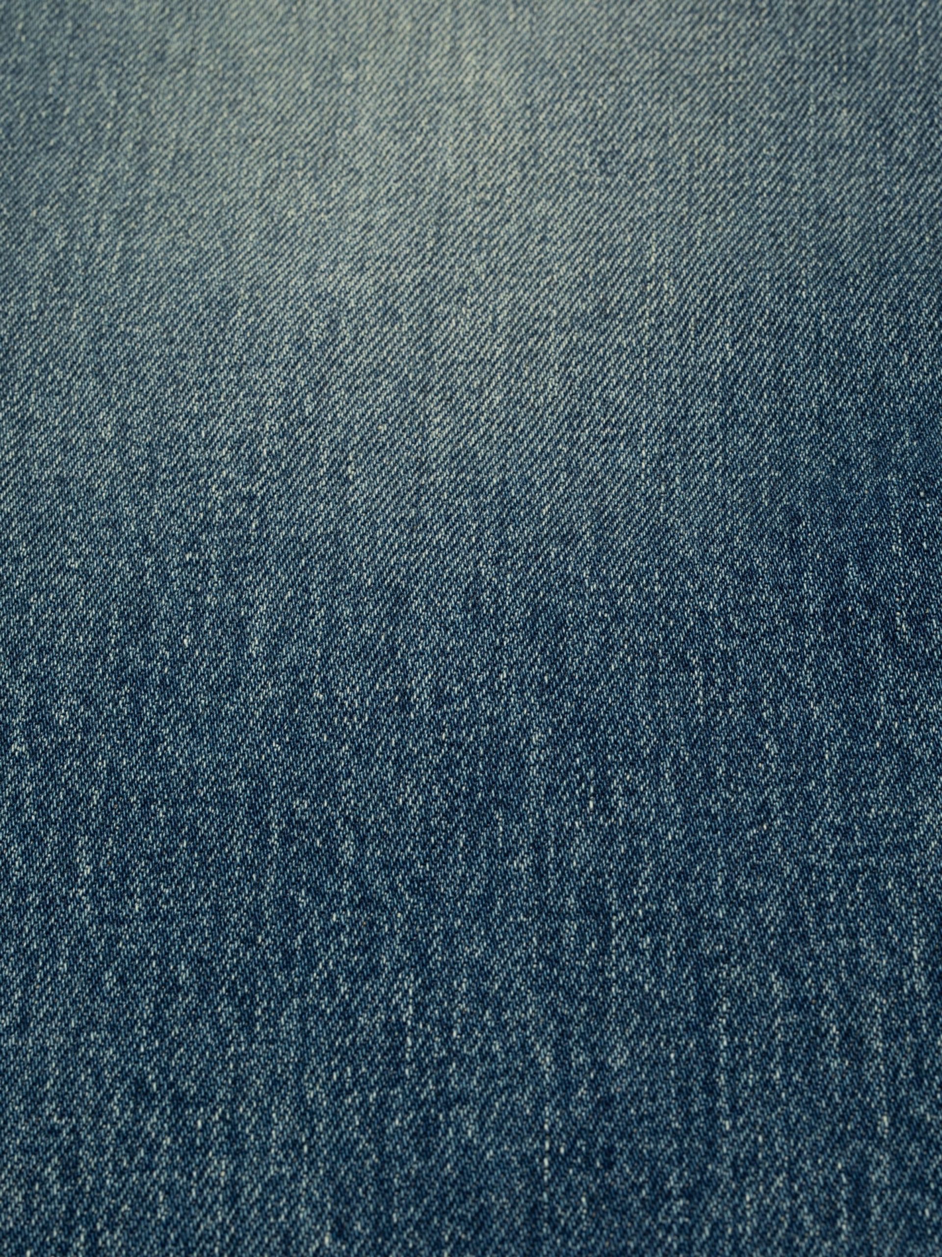 Slim-fit jeans with a slim leg, in a mid-blue wash featuring contrasting wear marks. Crafted from remarkably textured stretch denim, the wash exudes a rich yarn slub character, showcasing both a salt-and-pepper grain and a subtle crosshatch. Highlighting and warm abrasions add character and a lovely range of skewed indigo shades.