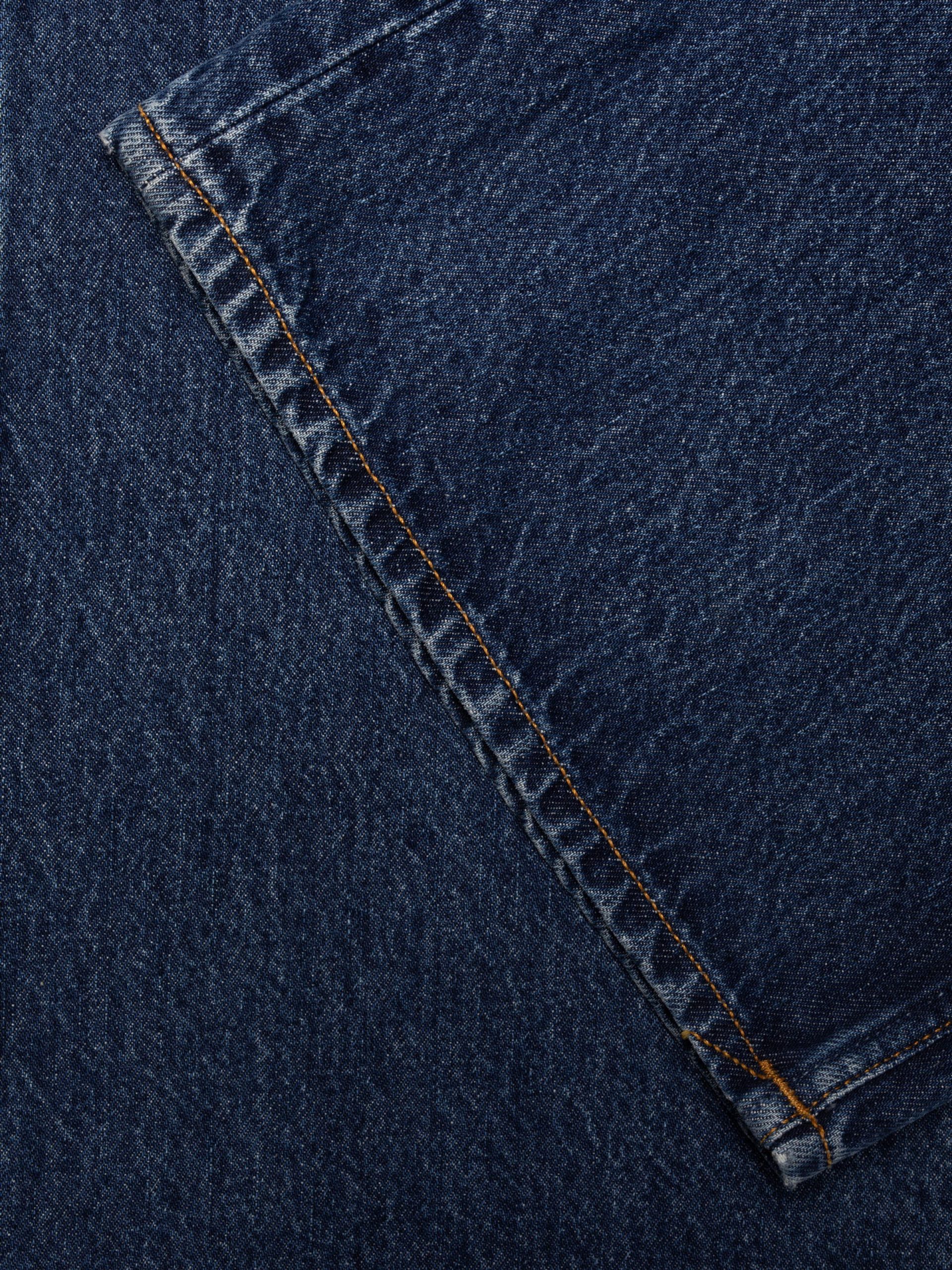 Loose-fit jeans with a wide leg and low waist in a soft, dark blue stonewash. Highlighted seams and subtle marbling add depth to the muted indigo hues. Made from organic cotton.